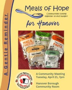 A Community Meeting will be held on Tuesday, April 21,at 7 pm to explain more about our Meal Packing plans. We will be meeting at the Borough of Hanover Community Meeting Room, 33 Frederick St. Parking will be available nearby in the lot of St. Matthew Lutheran Church. Learn more and register at our Facebook Event.